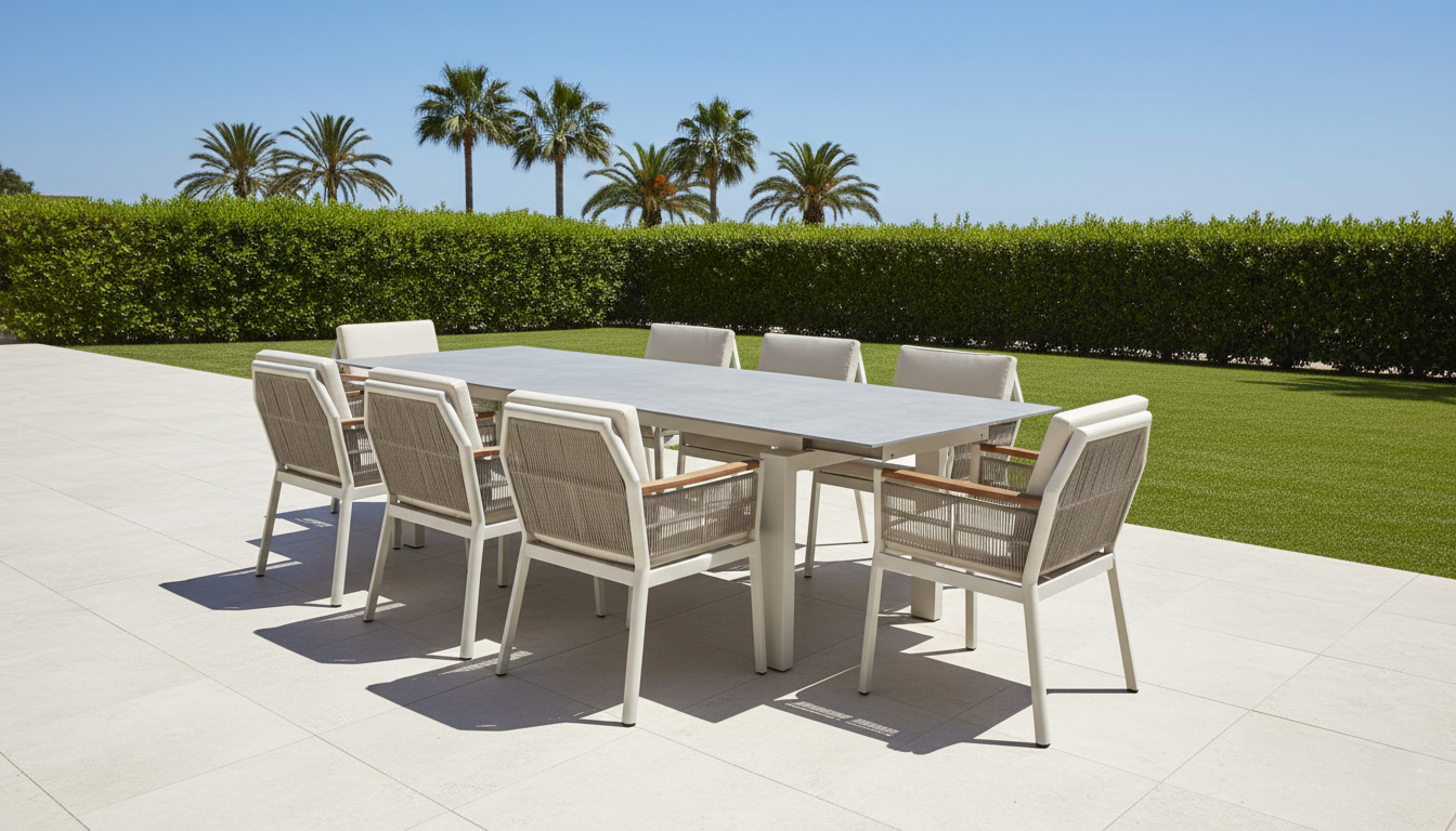 El Set COMO de ROCO combina elegancia, innovación y funcionalidad en un diseño pensado para el exterior contemporáneo. Formado por una mesa extensible con estructura de aluminio lacado y tablero efecto piedra cerámica, ofrece una estética sofisticada y resistente al uso intensivo. Las sillas incluyen respaldo y asiento de cuerda trenzada a mano, con detalles en madera natural en los reposabrazos y cojines tapizados en tejido técnico, que garantizan máximo confort y durabilidad frente a la intemperie. Su paleta neutra y materiales de alta gama permiten integrarlo en ambientes tanto residenciales como contract, aportando una atmósfera elegante y acogedora. El Set COMO es la opción ideal para quienes buscan versatilidad, resistencia y estilo atemporal en espacios al aire libre.