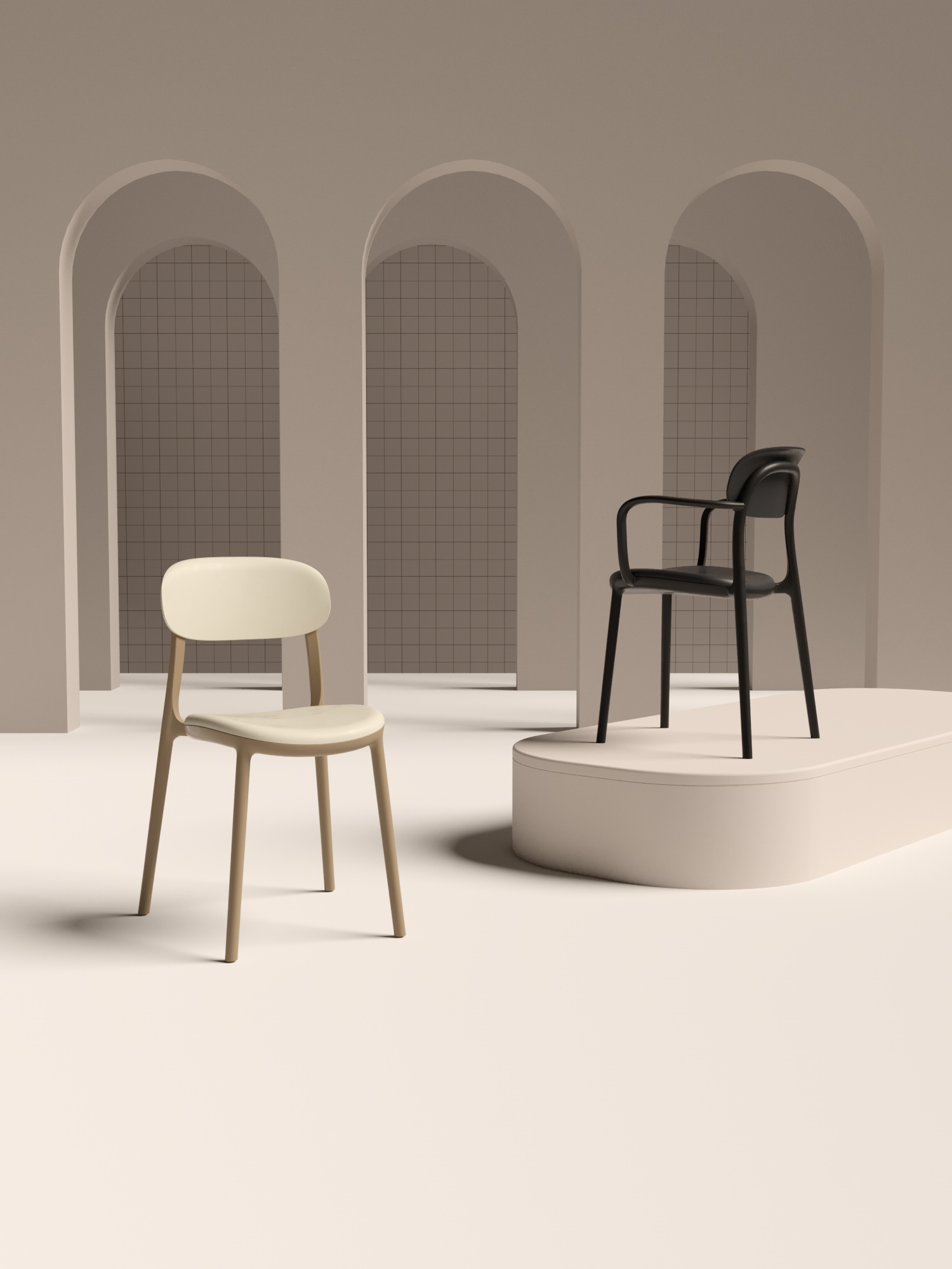 Su diseño bicolor genera un contraste sutil entre carcasa y patas, aportando dinamismo visual y modernidad sin renunciar a la sobriedad. Se ofrece en distintas combinaciones cromáticas —gris perla/gris hielo, negro/antracita, arena/crema y peppermint/menta—, lo que permite integrarla con naturalidad en ambientes de interior y exterior, ya sean terrazas, salones modernos o cafeterías con personalidad.