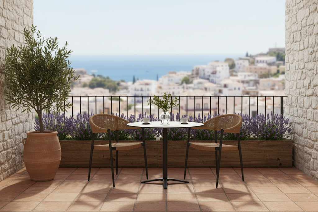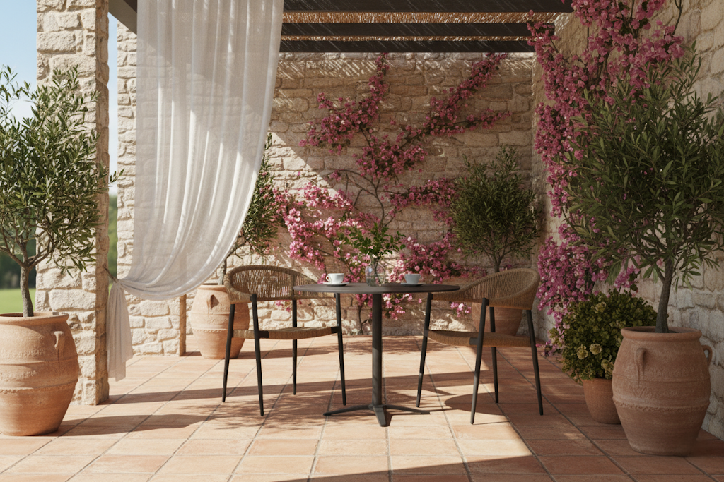 El M2204 destaca por su armazón de aluminio plastificado en antracita y un asiento–respaldo en cuerda sintética imitación enea (color natural), logrando un equilibrio entre resistencia y cálida materialidad. La lectura natural de la cuerda rescata un guiño artesanal que, combinado con el aluminio, rinde en espacios exteriores de hostelería con alto tránsito, aportando confort visual y una estética atemporal. Ideal para terrazas, jardines y patios cubiertos, el M2204 facilita composiciones que juegan con maderas, fibras y metales, alineadas con las tendencias de materiales naturales y metálicos en contract.