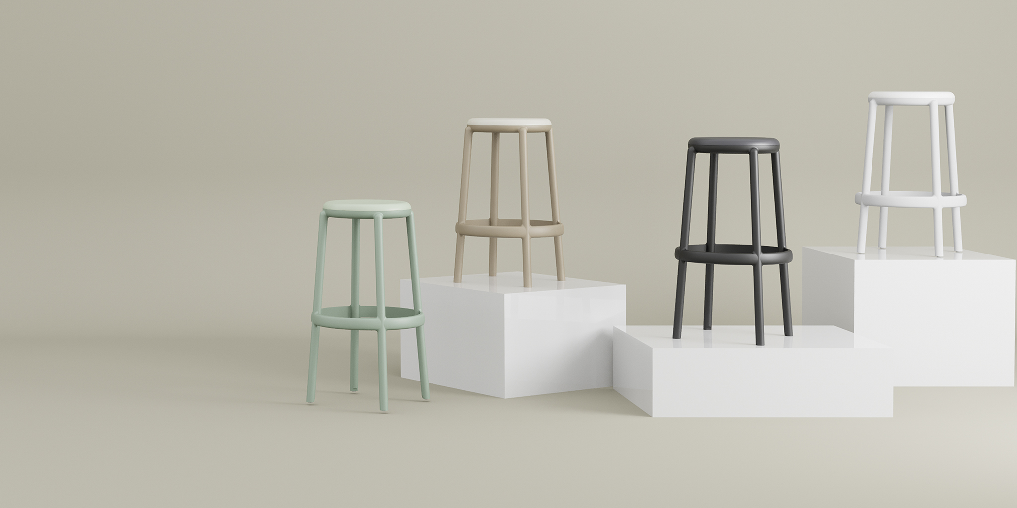 Con 75 cm de altura total y un asiento de 36,5 cm de diámetro, su diseño monobloque aporta estabilidad y ergonomía, asegurando comodidad sin renunciar a la estética. Se presenta en una paleta versátil —arena/sand, negro/antracita, peppermint y gris perla/gris hielo—, lo que permite mantener la coherencia cromática en proyectos de hostelería y contract.