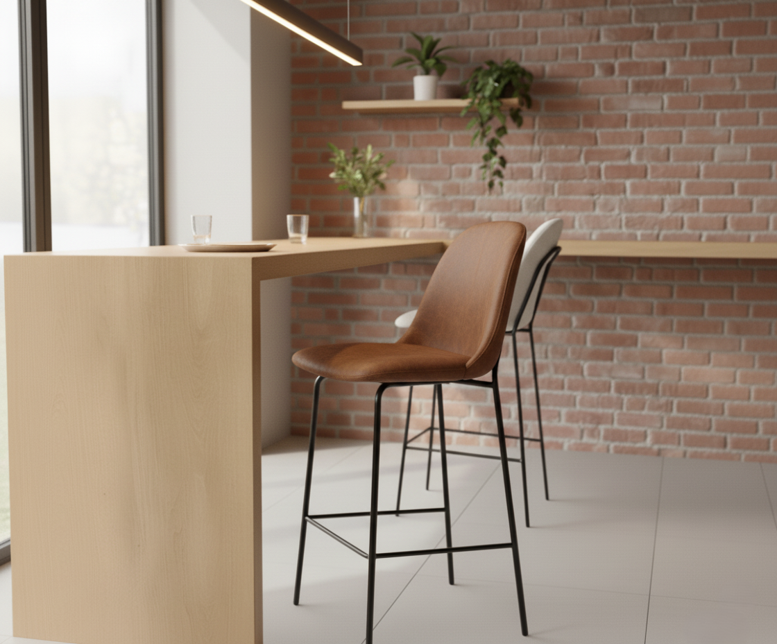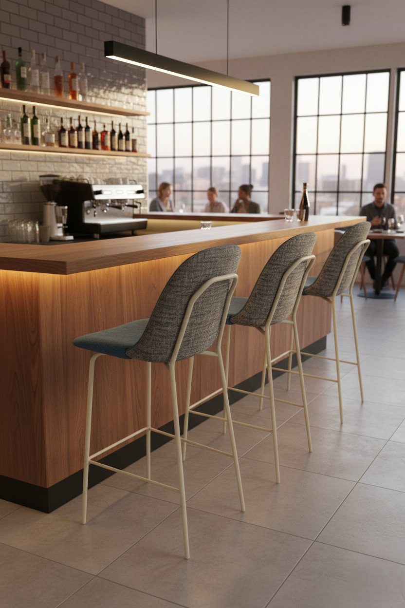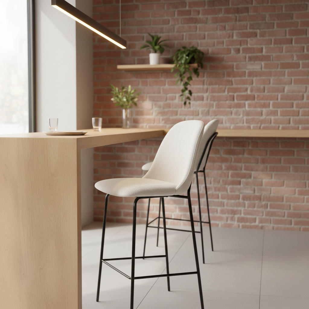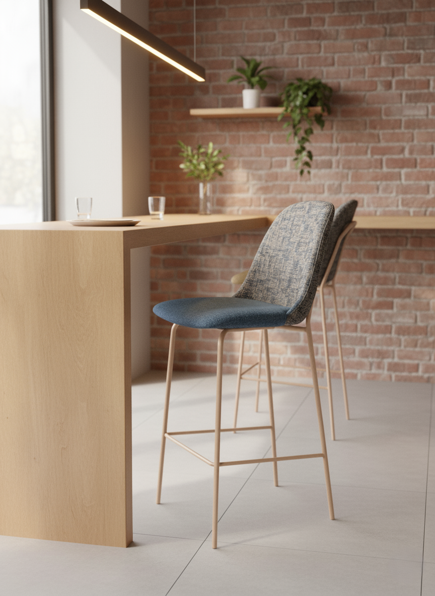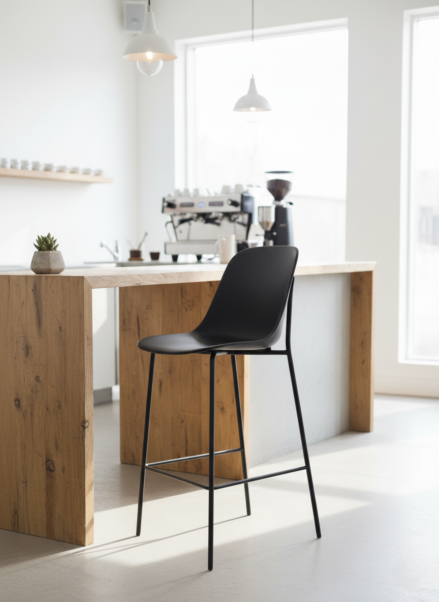 Es un taburete pensado para interior. Su silueta envolvente aporta apoyo lumbar y comodidad en barra, mientras que los materiales (metal o polipropileno) facilitan la limpieza y el mantenimiento diario —ventajas clave para hostelería con alta rotación—. Shell Bar funciona muy bien en barras de gastrobares, coctelerías y zonas de hotel donde se busca un equilibrio entre ergonomía, contundencia estructural y coherencia estética con el proyecto.