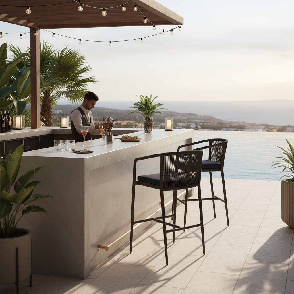 Por su condición de producto apto para exterior, 5203C resulta idóneo para terrazas, chill-outs de hotel o zonas al aire libre de restaurantes; la combinación aluminio + cuerda proporciona una estética natural y, al mismo tiempo, un mantenimiento sencillo y un comportamiento fiable frente al uso intensivo en temporada. Además, su altura ligeramente más baja que la de un taburete tradicional hace que sea cómodo para cualquier tipo de persona. La ficha incluye medidas útiles para planificación (altura total, altura de asiento, anchos y profundidad), lo que facilita comprobar compatibilidades con mesas de terraza y recorridos dentro del proyecto. En resumen: una opción resistente, y pensada para proyectistas que buscan coherencia entre estética exterior y operativa.
