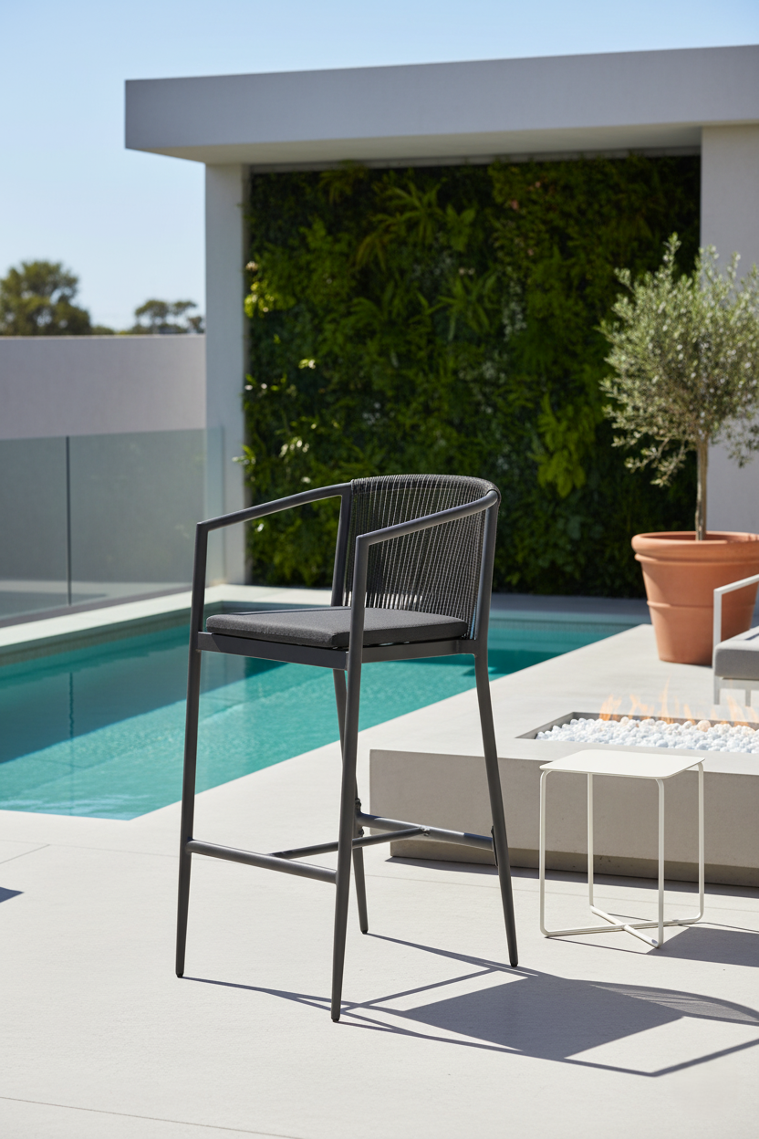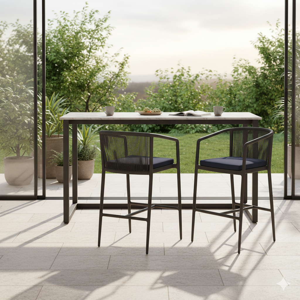 El taburete 5203C es una pieza diseñada para uso exterior e interior que combina estructura ligera y aspecto natural gracias al contraste entre su armazón de aluminio plastificado y los asientos de cuerda. La ficha técnica especifica que el armazón está plastificado en color antracita y que el asiento y respaldo están realizados en cuerda sintética. Un acabado elegante que aporta textura y calidez visual sin renunciar a la durabilidad necesaria en cualquier espacio.